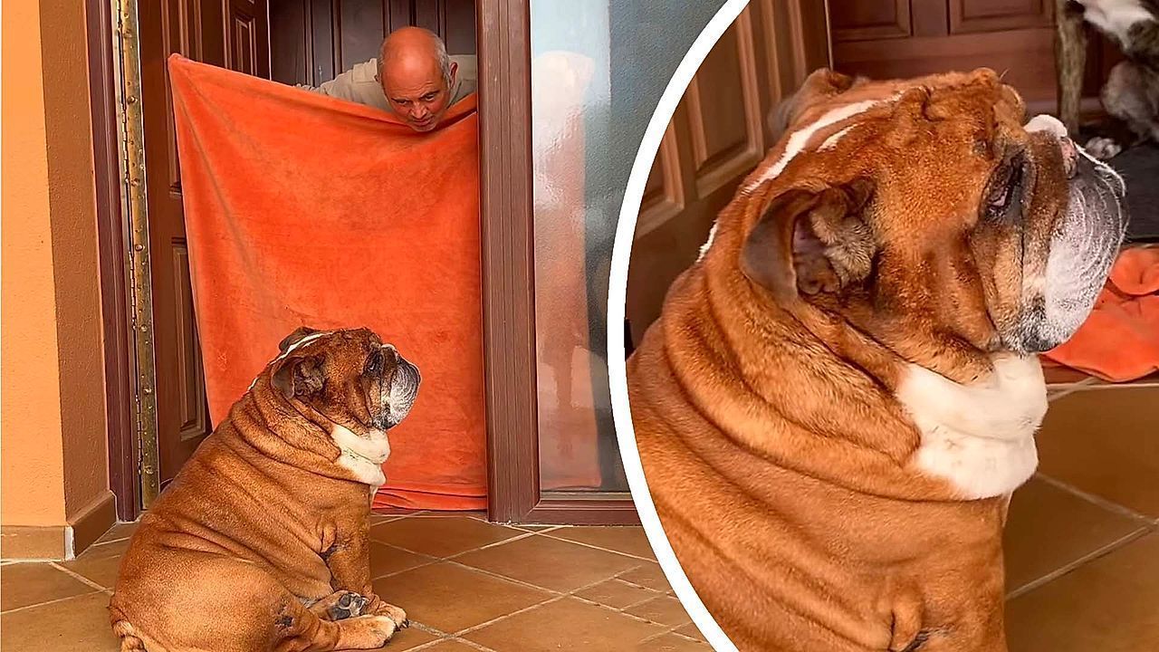 Ωστόσο, το αγγλικό μπουλντόγκ που βρίσκεται δίπλα του παραμένει εντελώς αδιάφορο και ακίνητο, αγνοώντας την κατάσταση. Η αντίδραση του μπουλντόγκ προσφέρει μια χιουμοριστική διάσταση στην κατάσταση, ενώ αναδεικνύει τη διαφορετική προσωπικότητα των δύο σκύλων.