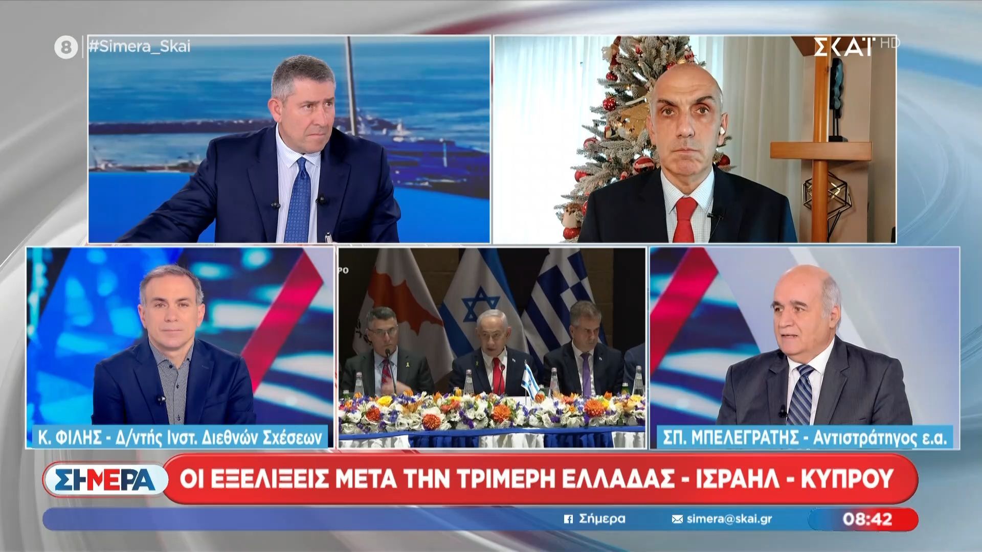 Ο Διευθυντής του Ινστιτούτου Διεθνών Σχέσεων, Κωνσταντίνος Φίλης, και ο Αντιστράτηγος ε.α., Σπύρος Μπελεγράτης, αναλύουν τη σημασία της τριμερούς συνεργασίας Ελλάδας, Ισραήλ και Κύπρου κατά τη διάρκεια της συνέντευξής τους. Η συζήτηση επικεντρώνεται και στις πρόσφατες θεωρίες συνωμοσίας που έχουν προκύψει γύρω από την πτώση αεροσκάφους στην Άγκυρα.