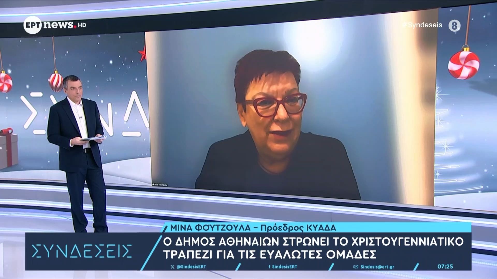 Ο Δήμος Αθηναίων αναλαμβάνει πρωτοβουλία για την υποστήριξη ευάλωτων ομάδων, διοργανώνοντας ένα χριστουγεννιάτικο τραπέζι. Η πρόεδρος του ΚΥΑΔΑ, Μίνα Φούτζουλα, επισημαίνει τη σημασία της κοινωνικής αλληλεγγύης και της στήριξης των πολιτών που βρίσκονται σε ανάγκη κατά την εορταστική περίοδο.