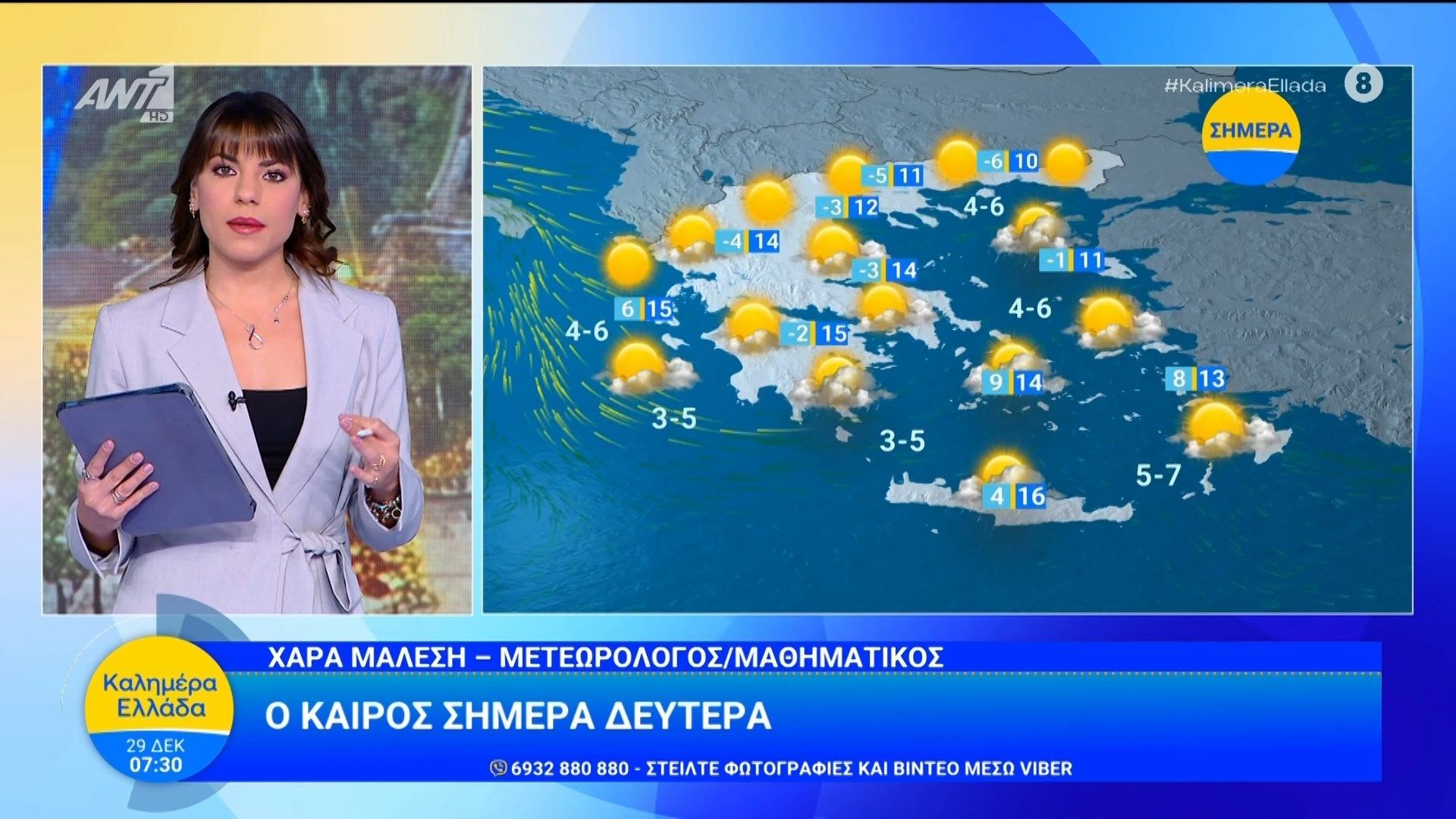 Η Χαρά Μάλεση μας ενημερώνει για τις καιρικές συνθήκες της ημέρας, με έμφαση στις μεταβολές που αναμένονται. Οι θερμοκρασίες κυμαίνονται σε φυσιολογικά για την εποχή επίπεδα, ενώ πιθανές βροχοπτώσεις θα επηρεάσουν κυρίως τις δυτικές περιοχές της χώρας.