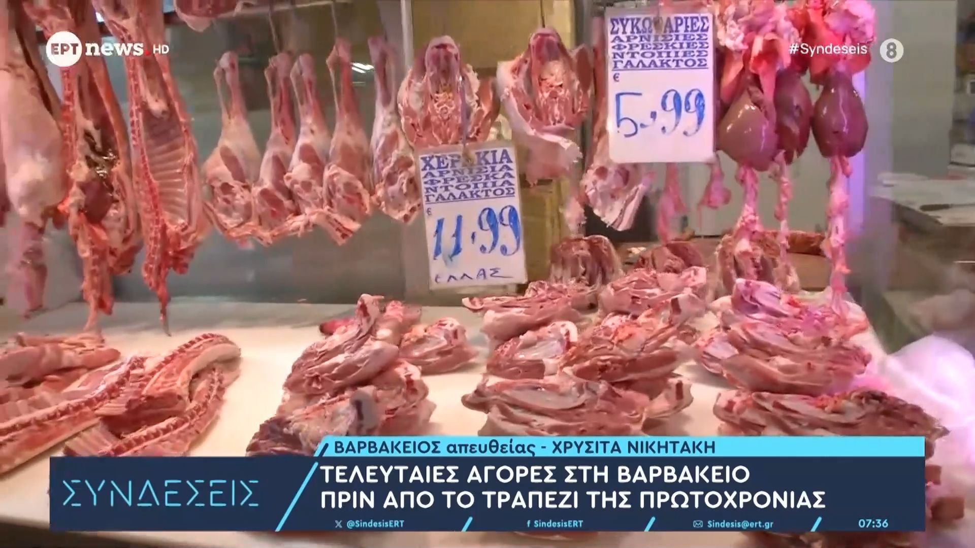 Οι έμποροι και οι καταναλωτές στη Βαρβάκειο αγορά βρίσκονται σε πυρετό προετοιμασίας για τις γιορτές της Πρωτοχρονιάς. Πλήθη κόσμου συνωστίζονται στα πάγκους για να προμηθευτούν φρέσκα κρέατα, ψάρια και παραδοσιακά εδέσματα, προσπαθώντας να διασφαλίσουν την καλύτερη ποιότητα για το εορταστικό τραπέζι.