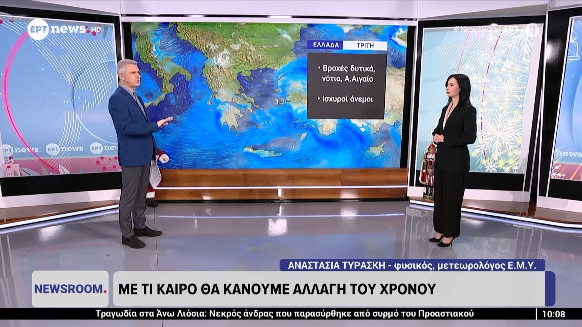Η Αναστασία Τυράσκη αναλύει τις επικρατούσες καιρικές συνθήκες και δίνει χρήσιμες συμβουλές για τον εορτασμό της Πρωτοχρονιάς. Οι πολίτες καλούνται να προγραμματίσουν τις δραστηριότητές τους ανάλογα με την πρόγνωση, ώστε να απολαύσουν με ασφάλεια την αλλαγή του χρόνου.