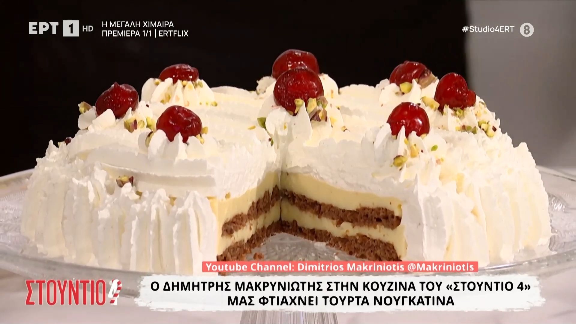 Ο Δημήτρης Μακρυνιώτης μας παρουσιάζει μια νόστιμη συνταγή για τούρτα νουγκατίνα, ιδανική για κάθε γιορτή. Χρησιμοποιεί φρέσκα υλικά όπως ασπράδια αβγών, αμύγδαλα και κανέλα για τη βάση, δημιουργώντας φύλλα νουγκατίνας που προσφέρουν μια ελαφριά και τραγανή υφή.
