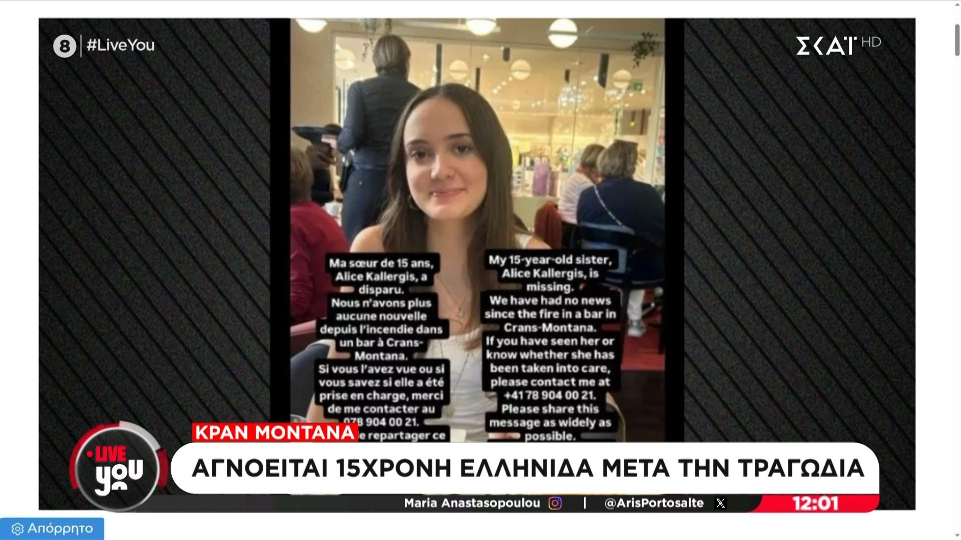 Νεαρή Ελληνίδα 15 ετών αγνοείται μετά την τραγωδία που έπληξε το Κραν Μοντανά, όπου πολλοί είναι οι αγνοούμενοι και οι τραυματίες. Ο απολογισμός περιλαμβάνει...