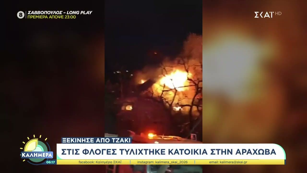 Κατοικία στην Αράχωβα καταστράφηκε από φωτιά που εκδηλώθηκε το πρωί. Σύμφωνα με τις πρώτες εκτιμήσεις, η φωτιά φαίνεται να ξεκίνησε από το τζάκι, προκαλώντας σοβαρές ζημιές στο κτίριο.