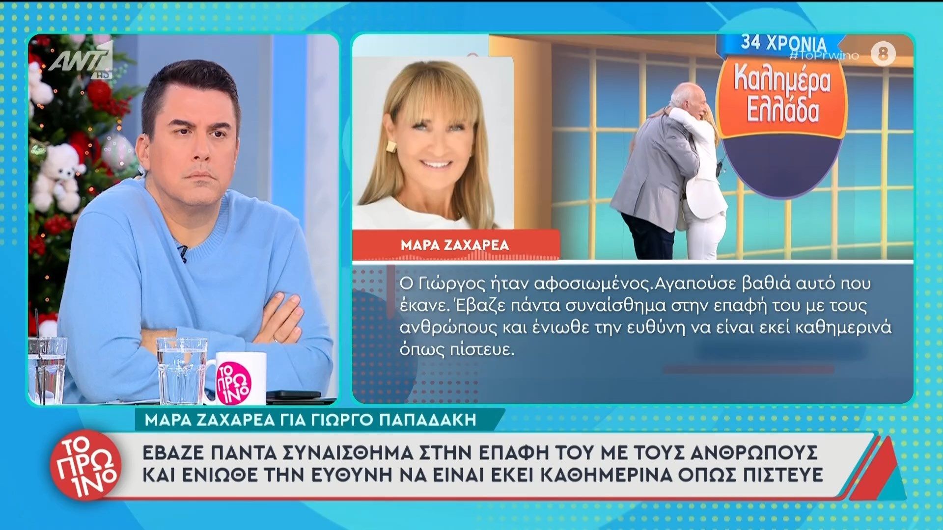 Σημαντικές προσωπικότητες της ελληνικής τηλεόρασης, όπως ο Αντώνης Σρόιτερ, η Μάρα Ζαχαρέα και η Σία Κοσιώνη, μοιράζονται τις σκέψεις τους για την καριέρα και την προσφορά του Γιώργου Παπαδάκη στην ενημέρωση. Στο πλαίσιο μιας ειλικρινούς συζήτησης, αναδεικνύουν τη σημασία του στην τηλεοπτική δημοσιογραφία και τις στιγμές που τον καθόρισαν.