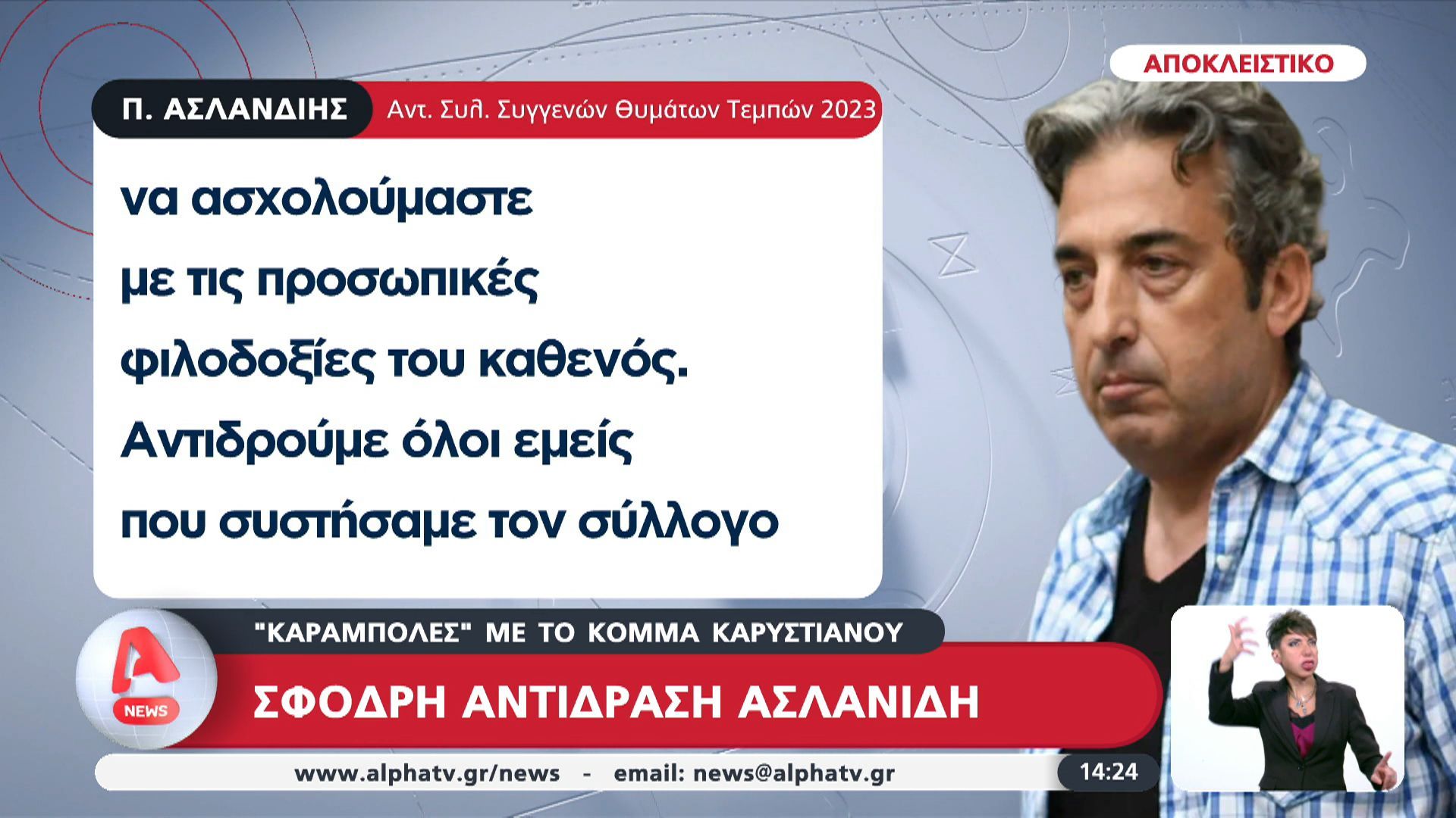 Ο Παύλος Ασλανίδης δήλωσε στον Alpha ότι οι πρόσφατες εξελίξεις γύρω από τη δημιουργία κόμματος από τη Μαρία Καρυστιανού υποδεικνύουν μια συνεχιζόμενη συγκάλυψη. Τόνισε την ανάγκη για ενότητα και ότι δεν είναι η κατάλληλη στιγμή για να ασχοληθούν με τις προσωπικές φιλοδοξίες.