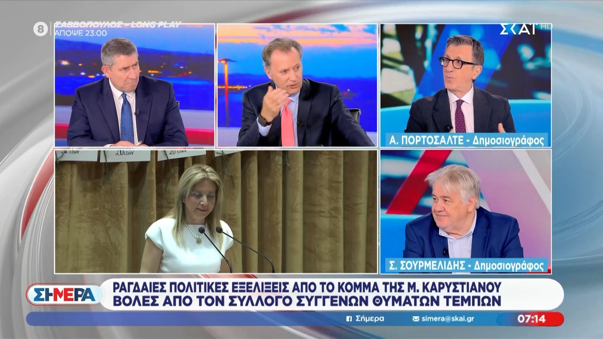 Ο Άρης Πορτοσάλτε και ο Σπύρος Σουρμελίδης συζητούν για την πολιτική κατάσταση και το νέο κόμμα της Μαρίας Καρυστιανού. Επισημαίνουν ότι η αναγκαία κάθαρση στην πολιτική σκηνή δεν μπορεί να επιτευχθεί μέσω επιφανειακών προσεγγίσεων, αλλά μόνο μέσω της εφαρμογής της Δικαιοσύνης.