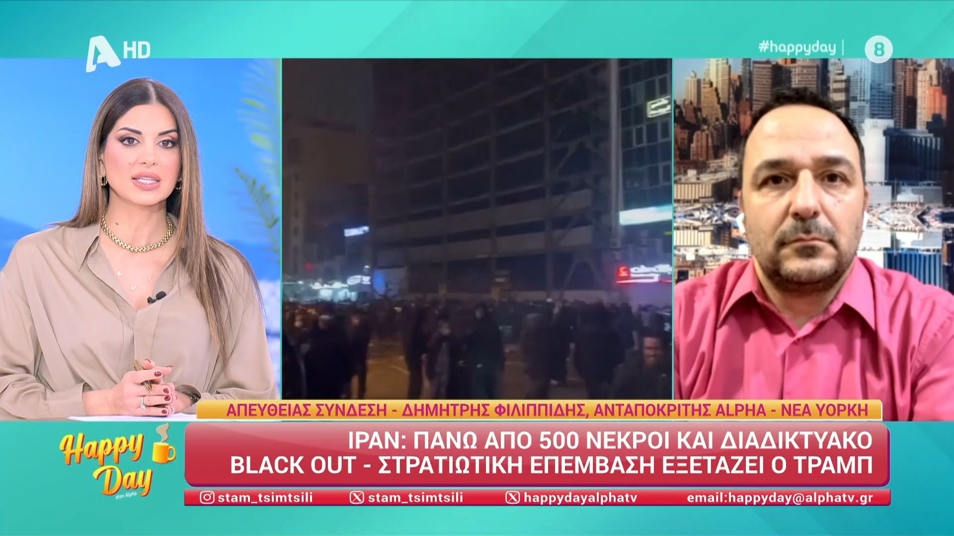 Στον απόηχο των γεγονότων, ο πρόεδρος των ΗΠΑ, Ντόναλντ Τραμπ, εξετάζει τη δυνατότητα στρατιωτικής παρέμβασης στη χώρα. Ο ανταποκριτής του Alpha, Δημήτρης Φιλιππίδης, παρέχει λεπτομέρειες και αναλύσεις για την τρέχουσα κατάσταση, καθώς οι διεθνείς αντιδράσεις συνεχώς αυξάνονται.