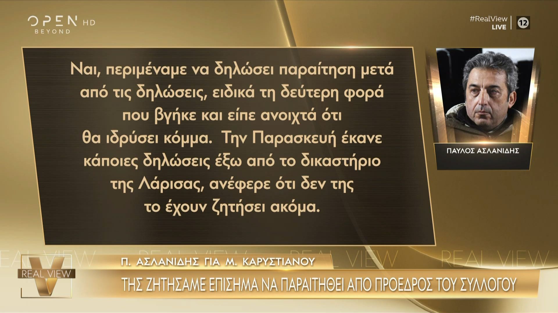 Ο Π. Ασλανίδης δήλωσε ότι η αντιπαράθεση με τη Μ. Καρυστιανού έχει φτάσει σε κρίσιμο σημείο, με τον ίδιο να επισημαίνει την ανάγκη για αλλαγές στη διοίκηση του Συλλόγου. Ζήτησε επίσημα την παραίτησή της από τη θέση της προεδρίας, υπογραμμίζοντας τις διαφωνίες τους σχετικά με τη διαχείριση κρίσιμων ζητημάτων.