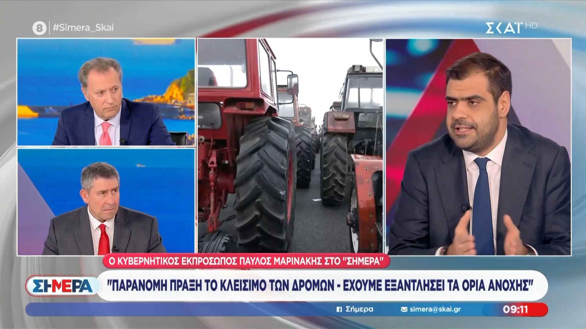 Ο κυβερνητικός εκπρόσωπος Παύλος Μαρινάκης προχώρησε σε δηλώσεις σχετικά με τις πρόσφατες αγροτικές κινητοποιήσεις, επισημαίνοντας την ανάγκη για διάλογο και συνεργασία με τους αγρότες. Αναφέρθηκε επίσης σε κομματικούς παράγοντες που, κατά τον ίδιο, προσπαθούν να υπονομεύσουν τη συνάντηση με τον Πρωθυπουργό.