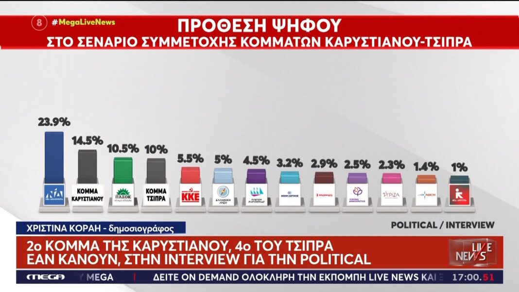 Η πολιτική σκηνή στην Ελλάδα αναδεικνύει νέες εξελίξεις, με τον Καρυστιανό να ανακοινώνει τη δημιουργία ενός νέου κόμματος που προσελκύει το ενδιαφέρον των ψηφοφόρων. Παράλληλα, ο ΣΥΡΙΖΑ του Αλέξη Τσίπρα φαίνεται να αντιμετωπίζει σοβαρές προκλήσεις, κατατάσσοντας τον σε τέταρτη θέση στις προτιμήσεις του κοινού.