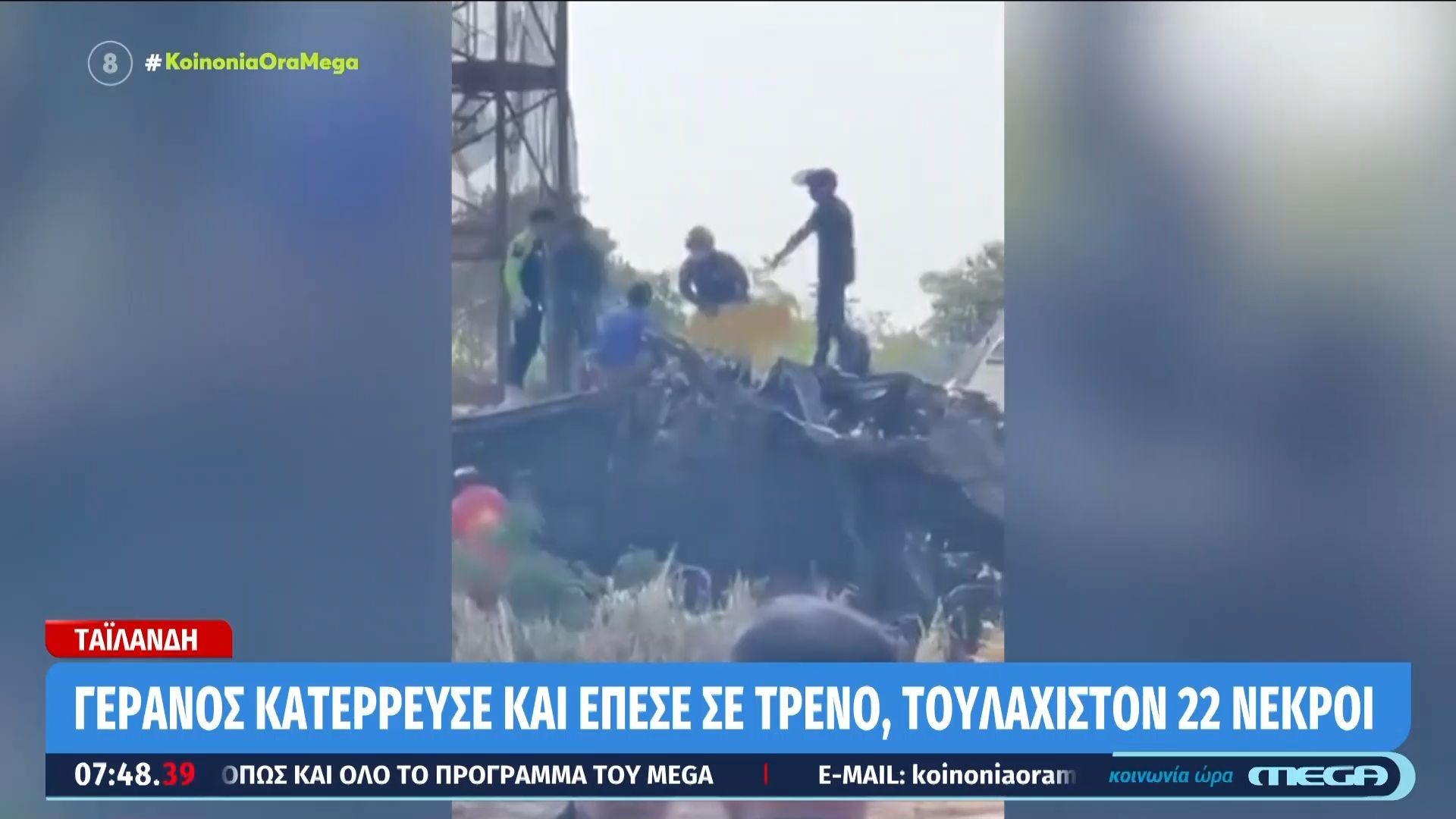 Στην Ταϊλάνδη, σημειώθηκε σοβαρό ατύχημα όταν γερανός κατέρευσε και έπεσε σε τρένο, προκαλώντας μαζικό θάνατο. Ο απολογισμός των θυμάτων ανέρχεται τουλάχιστον στους 22 νεκρούς, ενώ πολλοί άλλοι έχουν τραυματιστεί σοβαρά.