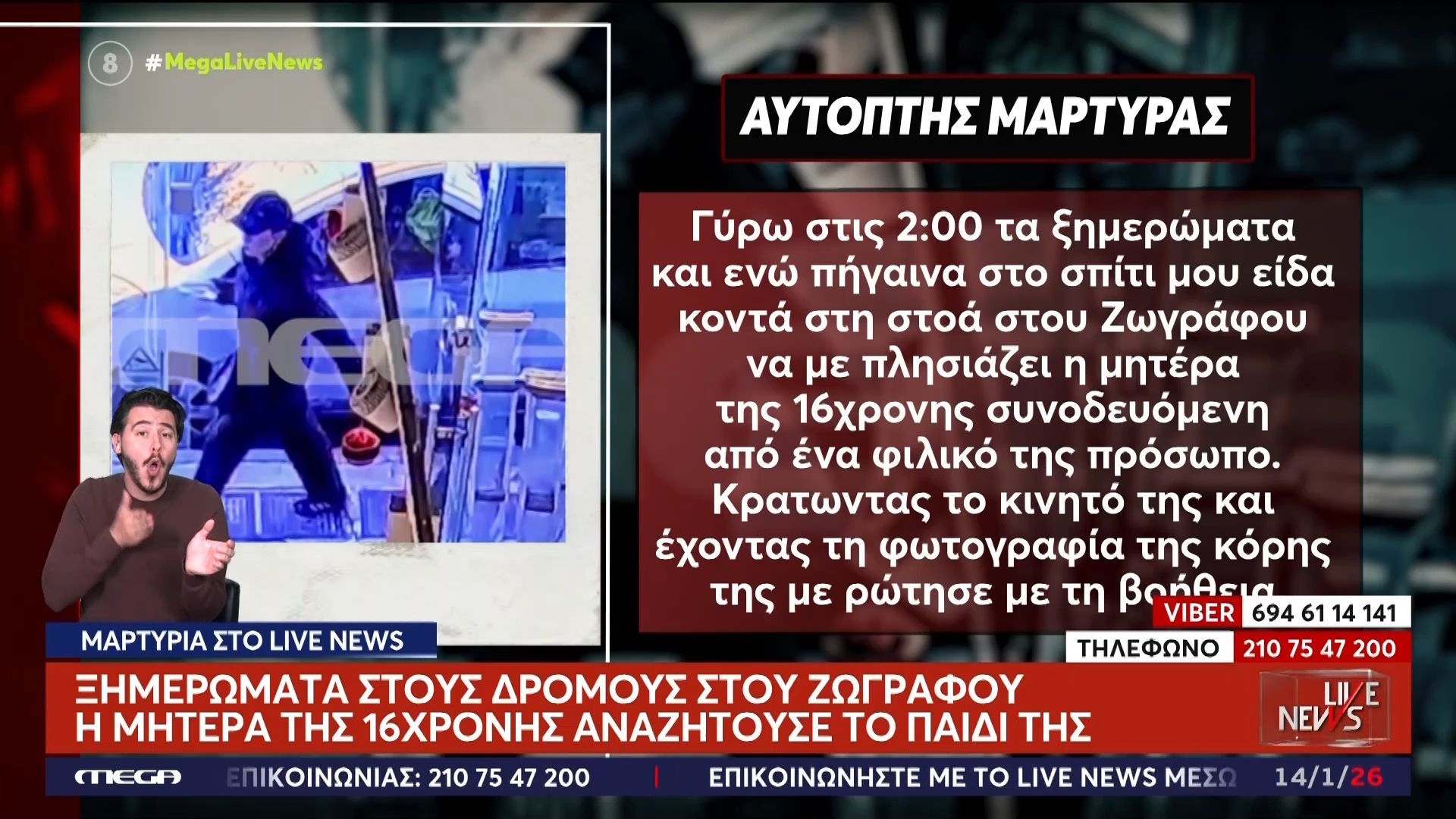 Ένας αυτόπτης μάρτυρας περιγράφει τη δραματική σκηνή που εκτυλίχθηκε στου Ζωγράφου, όταν είδε τη μητέρα της 16χρονης που αγνοείται να ψάχνει απεγνωσμένα για την κόρη της. Η μητέρα φαινόταν αναστατωμένη και ανήσυχη, ζητώντας βοήθεια από τους περαστικούς.