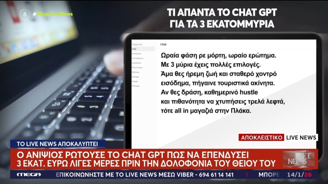 Διπλό φονικό συγκλονίζει τη Φοινικούντα, καθώς αποκαλύπτονται διάλογοι του ανιψιού του θύματος που εμπλέκονται στη δολοφονία. Σε αυτές τις συνομιλίες, ο κατηγορούμενος ζητούσε συμβουλές από την Τεχνητή Νοημοσύνη, αναζητώντας τρόπους να εξαφανίσει τα ίχνη του και να επενδύσει ένα ποσό ύψους 3 εκατομμυρίων ευρώ.