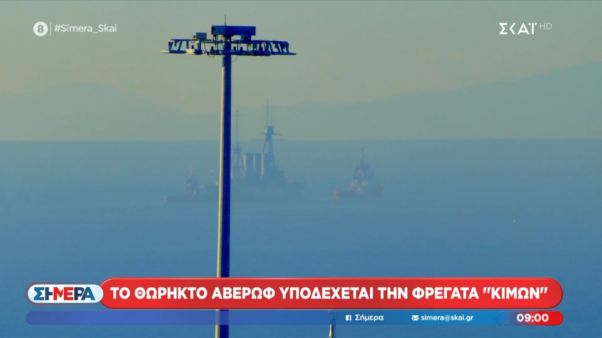 Το θωρηκτό «Αβέρωφ» ρυμουκλείται στα ανοιχτά της θάλασσας, ετοιμάζοντας μια ιστορική υποδοχή για τη φρεγάτα «Κίμων». Η εκδήλωση αυτή πραγματοποιείται στο πλαίσιο εορτασμών για την ιστορική σημασία των δύο πλοίων και τη συμβολή τους στην ελληνική ναυτική παράδοση.