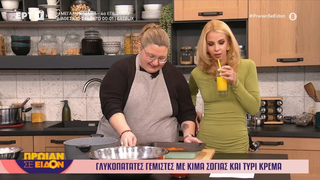 Η Γωγώ Δελογιάννη προτείνει μια γευστική και υγιεινή συνταγή, γεμίζοντας γλυκοπατάτες με κιμά σόγιας και τυρί κρέμα. Η διαδικασία περιλαμβάνει τη χρήση φρέσκων υλικών όπως κρεμμύδια, σκόρδο, καρότο και αρωματικά βότανα, που αναδεικνύουν τη γεύση του πιάτου.