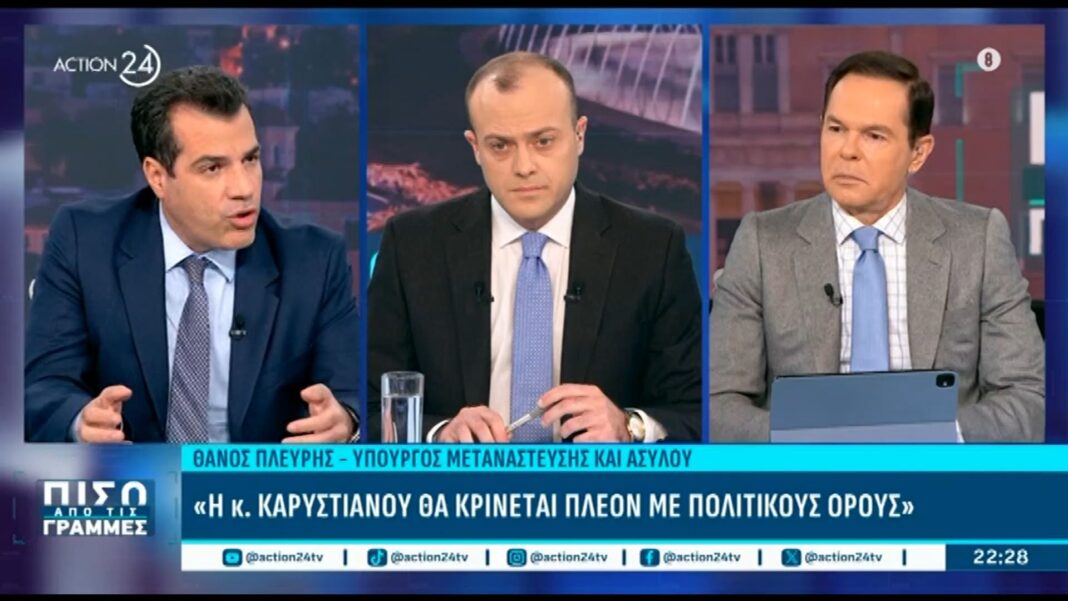 Ο Υπουργός Μετανάστευσης και Ασύλου, Θάνος Πλεύρης, αναφέρθηκε στη μήνυση που έχει καταθέσει εναντίον του η Μ. Καρυστιανού, δηλώνοντας ότι παρά τις διαφωνίες τους, την σέβεται ως πολιτικό πρόσωπο. Υπογράμμισε ότι οι διαφορές τους θα πρέπει να κρίνoνται πλέον με πολιτικούς όρους.