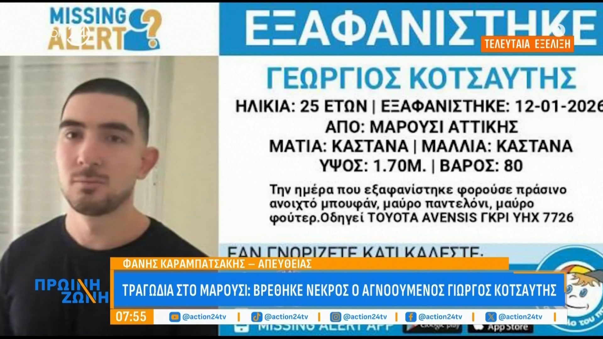 Γιώργος Κοτσαύτης, 25 ετών, εντοπίστηκε νεκρός μετά από ημέρες αναζητήσεων από τις αρχές και εθελοντές στην περιοχή του Αμαρουσίου. Η οικογένειά του είχε δηλώσει την εξαφάνιση του νεαρού, προκαλώντας ανησυχία στην τοπική κοινότητα.