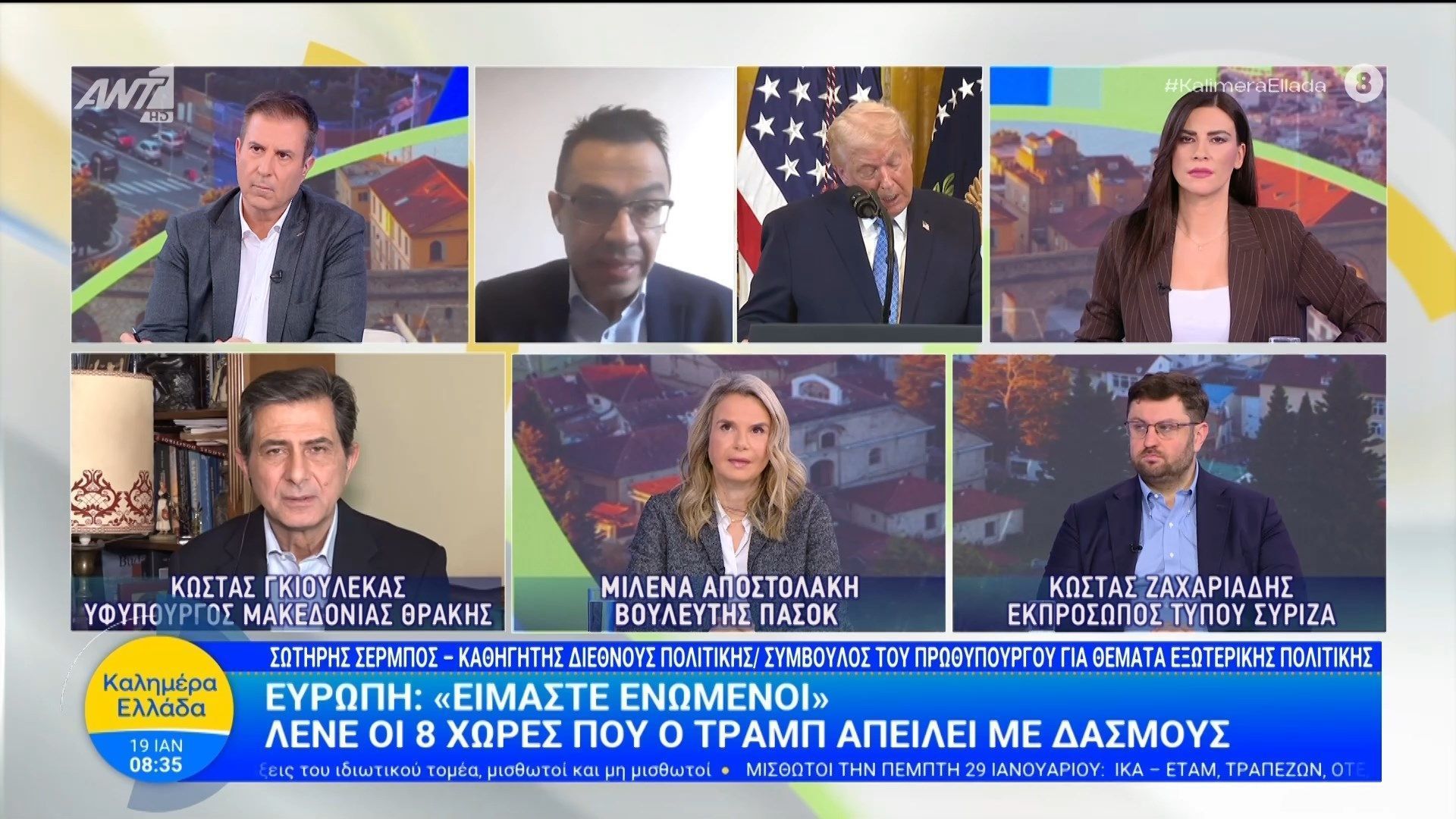 Ο Σωτήρης Σέρμπος, καθηγητής Διεθνούς Πολιτικής και σύμβουλος του πρωθυπουργού, αναλύει την πρόσφατη απειλή του πρώην προεδρικού υποψηφίου Ντόναλντ Τραμπ προς οκτώ ευρωπαϊκές χώρες σχετικά με την επιβολή δασμών. Οι χώρες αυτές δηλώνουν την ενότητά τους και τονίζουν την ανάγκη για συνεργασία προκειμένου να αντιμετωπίσουν τις προκλήσεις που προέρχονται από την επιθετική εμπορική πολιτική.
