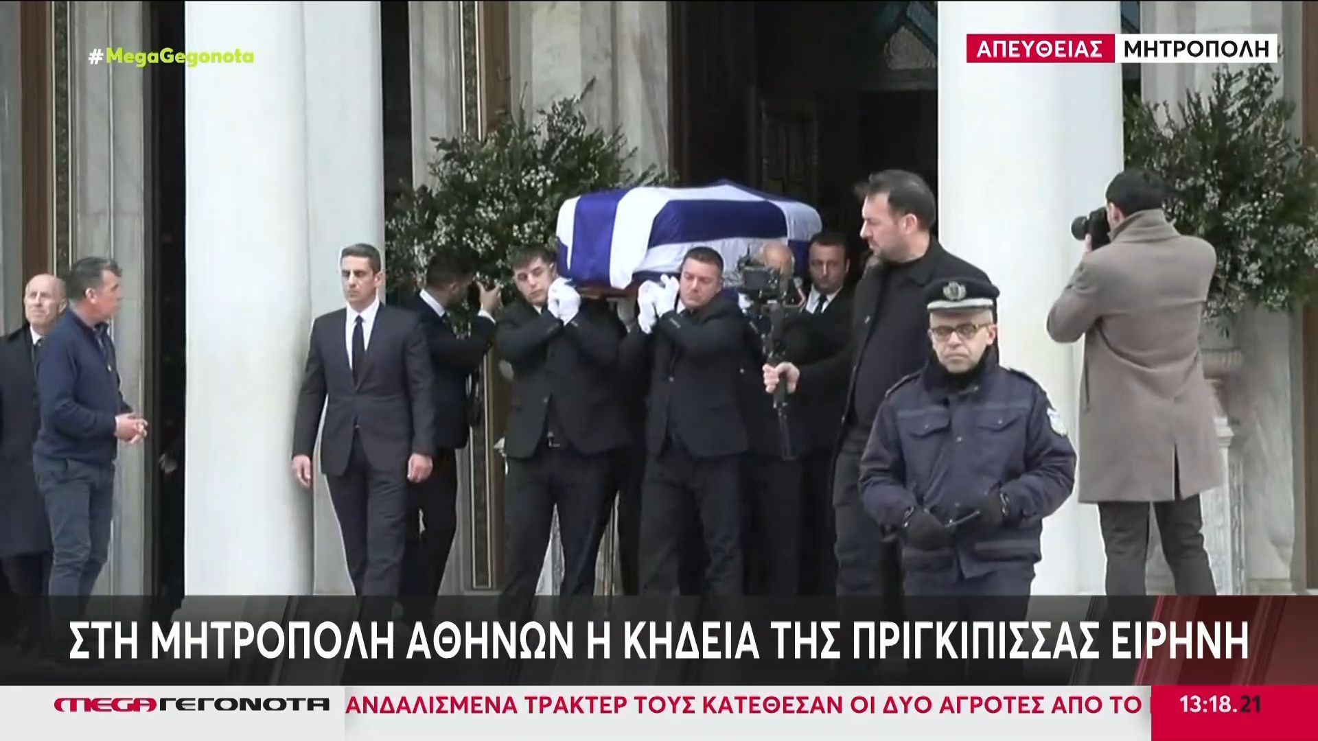 Η εξόδιος ακολουθία της Πριγκίπισσας Ειρήνης διεξάγεται αυτή τη στιγμή στον Μητροπολιτικό Ναό Αθηνών, με πλήθος κόσμου να συγκεντρώνεται για να αποχαιρετήσει την εκλιπούσα. Η κηδεία πραγματοποιείται με όλες τις τιμές που αρμόζουν σε μέλος της βασιλικής οικογένειας, εν μέσω συγκινητικών στιγμών.