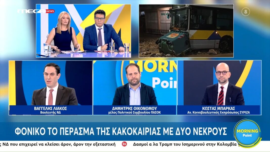 Στην εκπομπή «Morning Point» πραγματοποιήθηκε έντονη πολιτική αντιπαράθεση σχετικά με την ετοιμότητα του κρατικού μηχανισμού ενόψει πλημμυρικών φαινομένων. Οι προσκεκλημένοι, Βαγγέλης Λιάκος, Δημήτρης Οικονόμου και Κώστας Μπάρκας, ανέλυσαν τις τρέχουσες προκλήσεις που αντιμετωπίζει η κυβέρνηση στο ζήτημα των αντιπλημμυρικών έργων.
