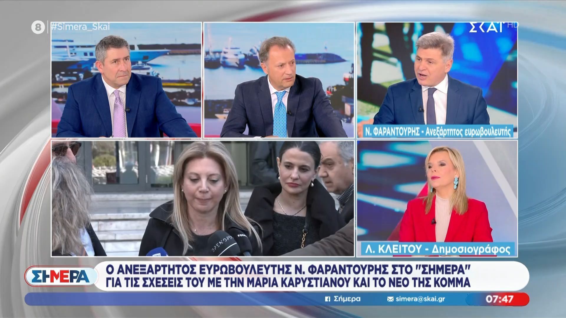 Σχολιάζοντας τις σχέσεις του με τη Μαρία Καρυστιανού, τόνισε ότι οι συζητήσεις που γίνονται γύρω από το νέο της κόμμα είναι πρόωρες. Ο Φαραντούρης κάλεσε την πολιτική σκηνή να παραμείνει ψύχραιμη και να εξετάσει τις πραγματικές προτάσεις που θα προκύψουν στο μέλλον.