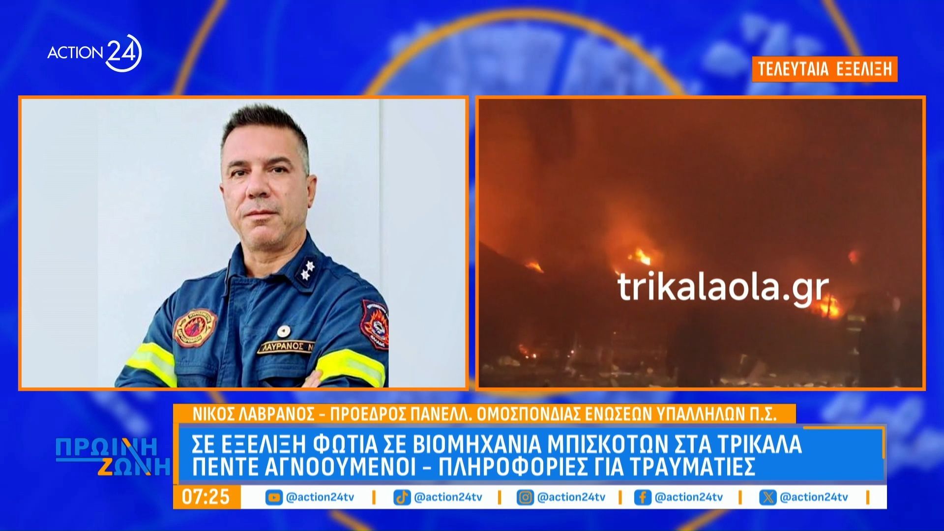 Σύμφωνα με δηλώσεις του Ν. Λαυράνου, η κατάσταση από τη φωτιά που ξέσπασε στα Τρίκαλα είναι ανησυχητική. Πέντε εργαζόμενες αγνοούνται, ενώ ένας πυροσβέστης έχει τραυματιστεί κατά την επιχείρηση κατάσβεσης.