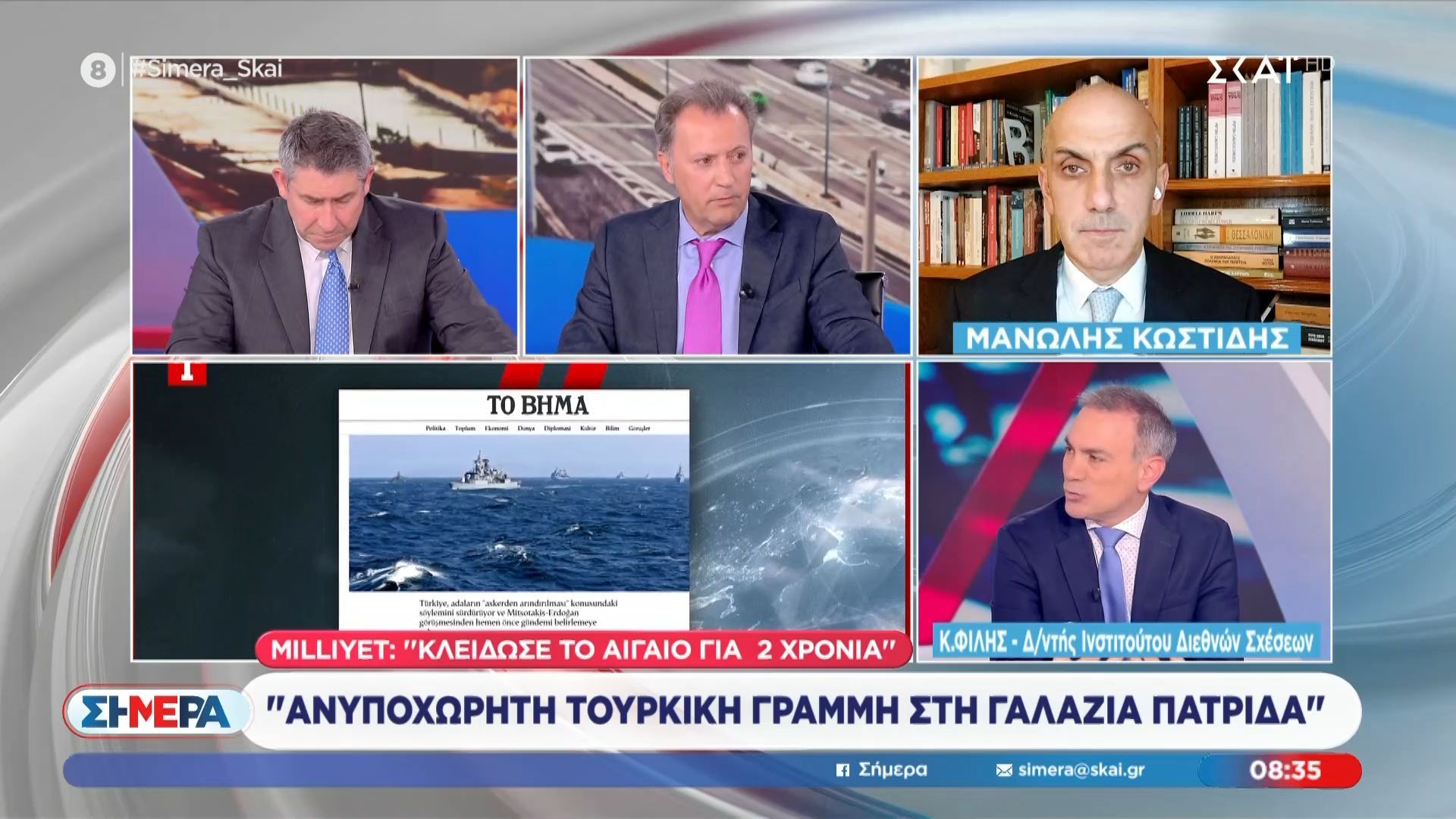 Ο Κωνσταντίνος Φίλης, Διευθυντής του Ινστιτούτου Διεθνών Σχέσεων, αναλύει τις πρόσφατες εξελίξεις στις σχέσεις Ελλάδας-Τουρκίας. Επισημαίνει ότι το τουρκικό στρατιωτικό κατεστημένο εκφράζει δυσαρέσκεια λόγω της αποχής από τις παραβιάσεις για 2,5 χρόνια, υποδεικνύοντας ότι η Τουρκία επιθυμεί να επανακαθορίσει τις θέσεις της.