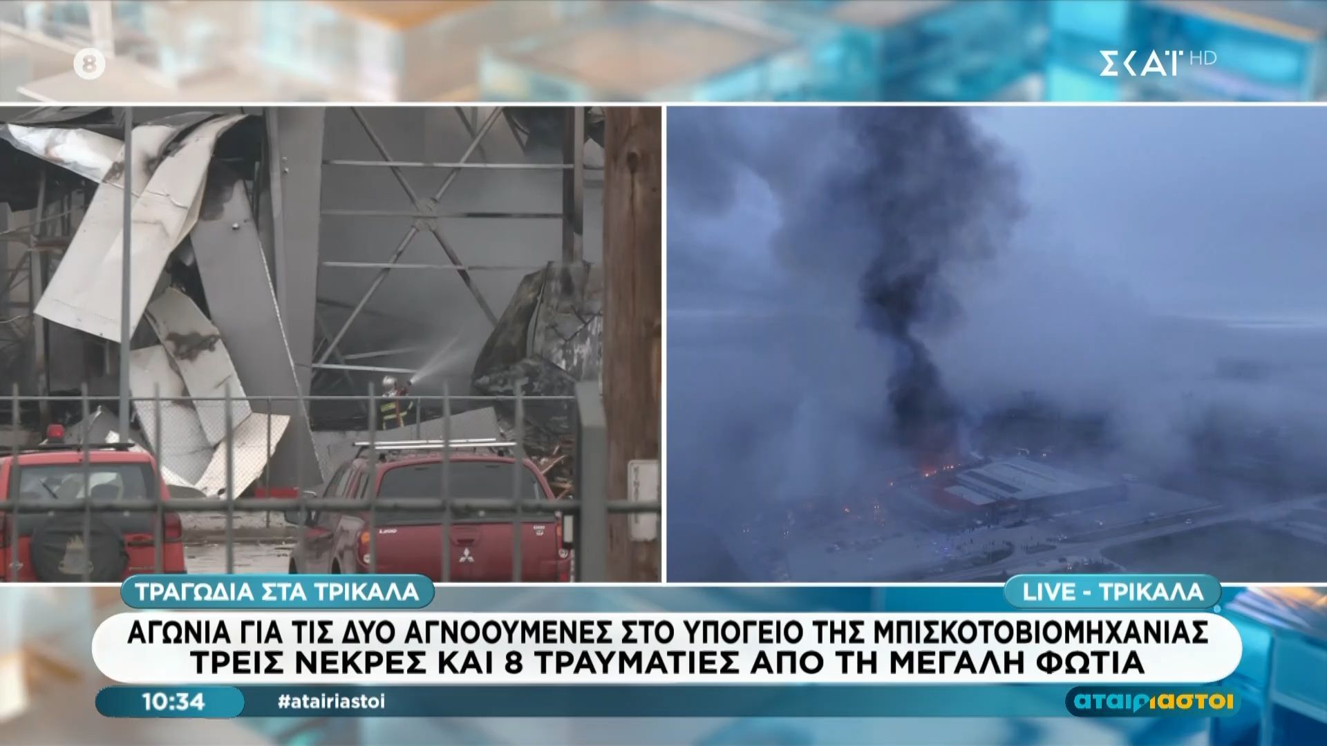 Συνεχίζεται η αγωνία στην περιοχή των Τρικάλων, καθώς οι αρχές καταβάλλουν κάθε δυνατή προσπάθεια για την ανεύρεση δύο αγνοουμένων που έχουν εγκλωβιστεί στο υπόγειο της μπισκοτοβιομηχανίας. Παρά τις φήμες που κυκλοφορούν, οι αρμόδιες αρχές διαψεύδουν τις πληροφορίες για τον θάνατο ενός τέταρτου ατόμου.
