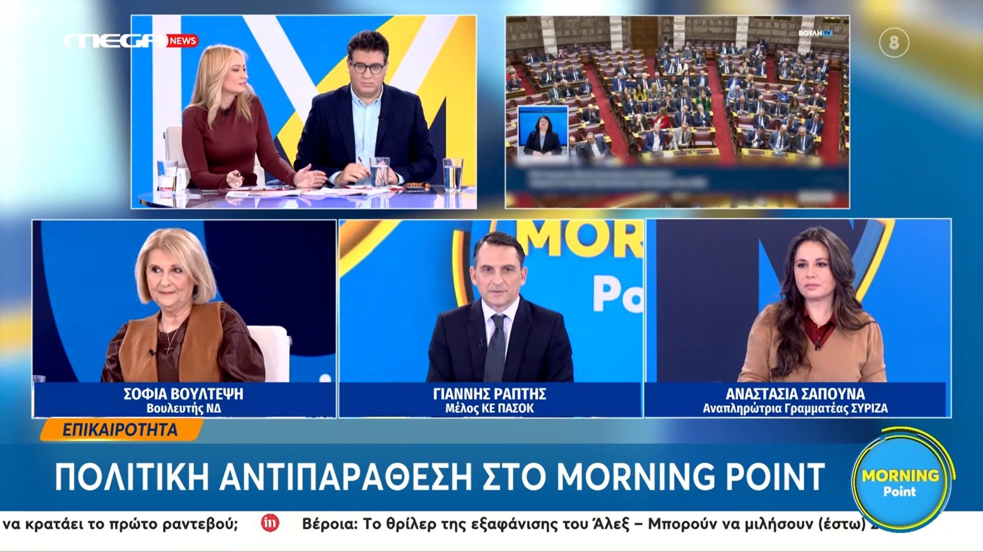 Στην εκπομπή «Morning Point», η Σοφία Βούλτεψη, ο Γιάννης Ράπτης και η Αναστασία Σαπουνά αναλύουν τα τρέχοντα πολιτικά και κοινωνικά ζητήματα που απασχολούν τη χώρα. Οι συμμετέχοντες μοιράζονται τις απόψεις τους για τις εξελίξεις στην πολιτική σκηνή, καθώς και τις προκλήσεις που αντιμετωπίζουν οι πολίτες.
