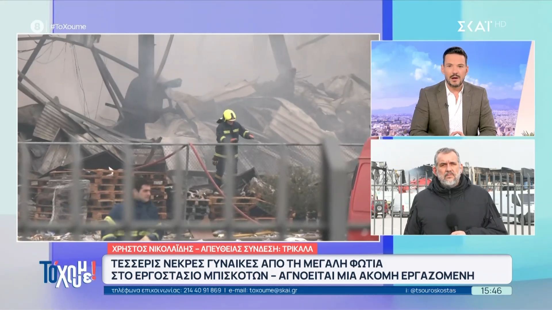 Στη διάρκεια μιας καταστροφικής φωτιάς που ξέσπασε σε εργαστάσιο μπισκότων στα Τρίκαλα, τέσσερις γυναίκες έχασαν τη ζωή τους. Οι αρχές ερευνούν τα αίτια της πυρκαγιάς, ενώ η ταυτότητα των θυμάτων έχει ήδη αναγνωριστεί.