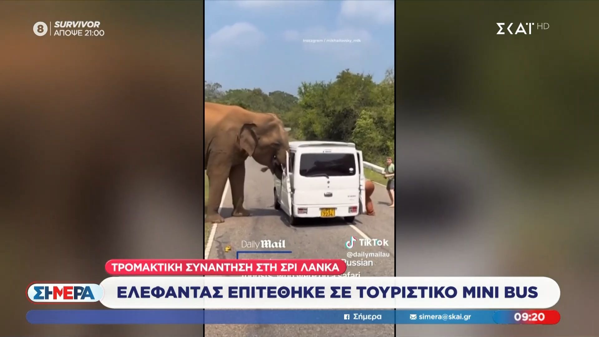 Τρομακτική εμπειρία βίωσαν οι επιβάτες ενός τουριστικού mini bus κατά τη διάρκεια της διαδρομής τους στη Σρι Λάνκα, όταν ένας ελέφαντας επιτέθηκε στο όχημα. Οι εικόνες από το περιστατικό είναι σοκαριστικές, με τον ελέφαντα να πλησιάζει απειλητικά και τους επιβάτες να πανικοβάλλονται.