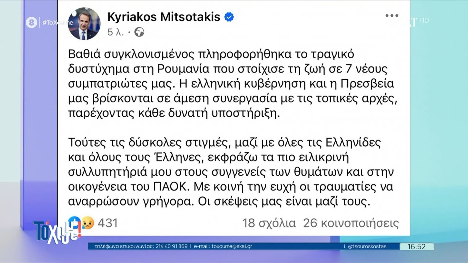 Ο Κυριάκος Μητσοτάκης εξέφρασε τα βαθιά του συλλυπητήρια για το τραγικό τροχαίο στην Ρουμανία, το οποίο έφερε τον θάνατο σε επτά οπαδούς του ΠΑΟΚ. Στην ανάρτησή του, χαρακτήρισε το γεγονός ως μια απώλεια που συγκλονίζει όχι μόνο τις οικογένειες των θυμάτων, αλλά και την ελληνική κοινωνία συνολικά.