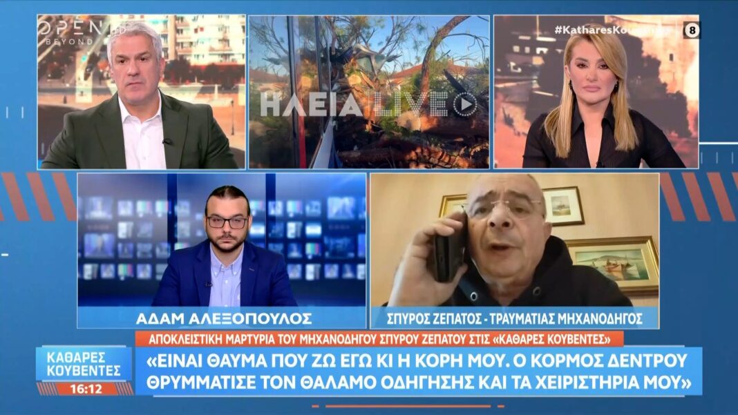 Στον Πύργο Ηλείας, ένα πεύκο κατέρρευσε και έπεσε πάνω σε επιβατικό τραίνο, με αποτέλεσμα να τραυματιστεί ο μηχανοδηγός. Ο Σπύρος Ζεπάτος νοσηλεύεται στο νοσοκομείο, από όπου μοιράζεται τις δραματικές στιγμές της εμπειρίας του.