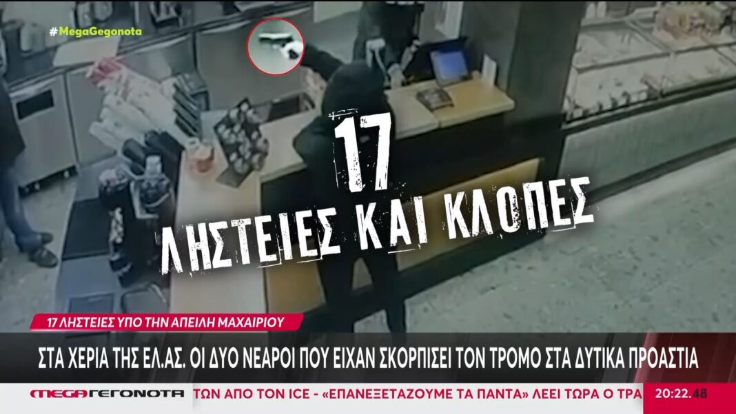 Δύο νεαροί συνελήφθησαν από την Ελληνική Αστυνομία μετά από σειρά ληστειών που είχαν προκαλέσει αναστάτωση στα Δυτικά Προάστια. Οι δράστες, που φέρονται να χρησιμοποιούσαν αεροβόλο όπλο, είχαν διαπράξει τουλάχιστον 17 ληστείες, στοχοποιώντας κυρίως καταστήματα και πολίτες.