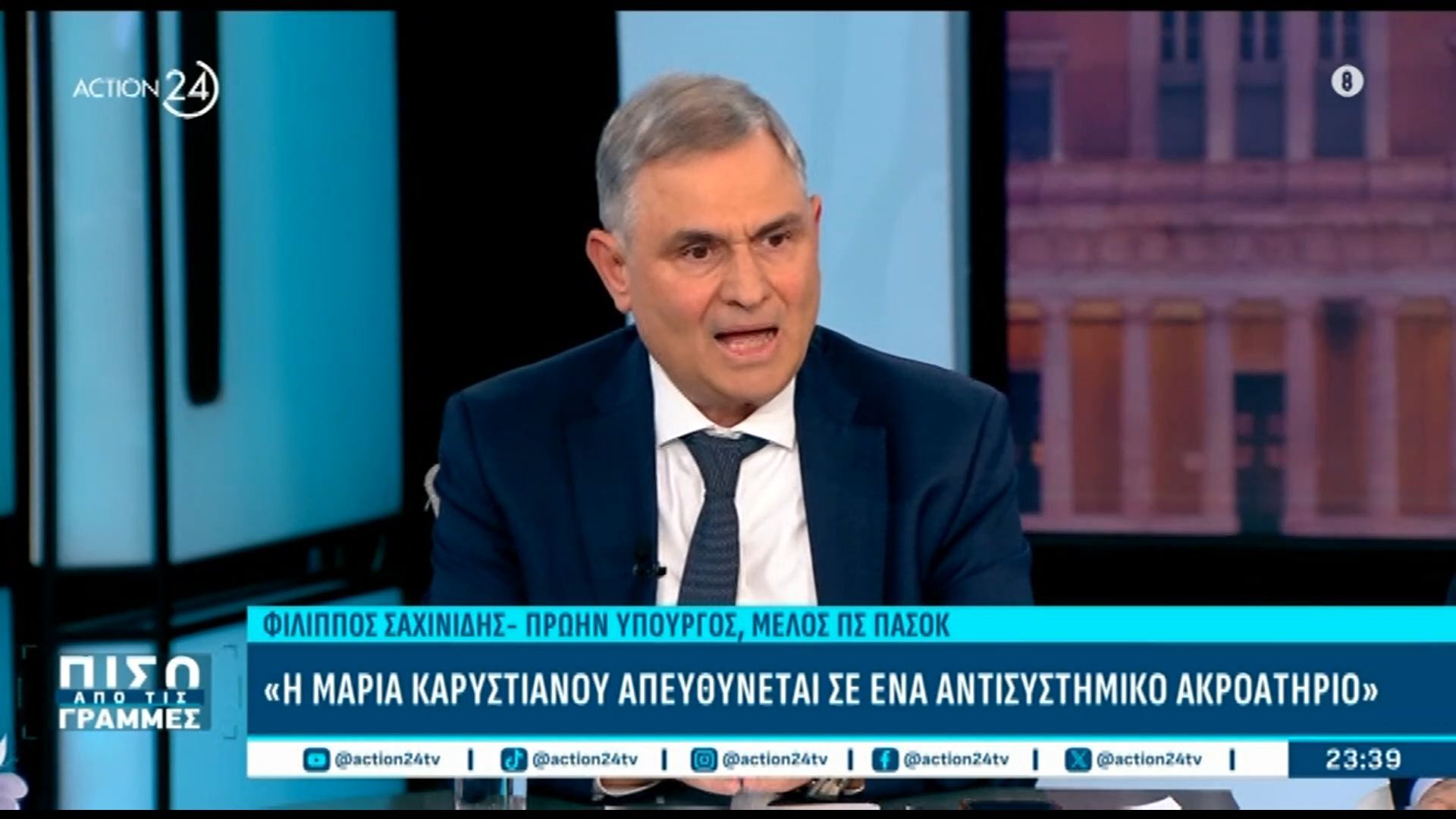 Ο Φ. Σαχινίδης αναλύει την πολιτική κατάσταση και εκφράζει την πεποίθησή του ότι το ΠΑΣΟΚ δεν κινδυνεύει από την Καρυστιανού. Επισημαίνει τη σημασία της ενδυνάμωσης και διεύρυνσης του κόμματος, προκειμένου να ενισχυθεί η παρουσία του στην πολιτική σκηνή.