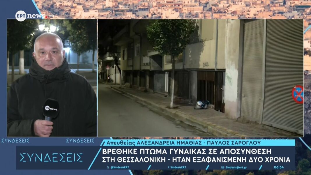 Το πτώμα μιας γυναίκας σε προχωρημένη αποσύνθεση ανακαλύφθηκε σε έναν απομονωμένο χώρο στη Θεσσαλονίκη. Η γυναίκα είχε δηλωθεί ως εξαφανισμένη εδώ και δύο χρόνια, και οι αρχές ξεκίνησαν έρευνες για τις συνθήκες της εξαφάνισής της.