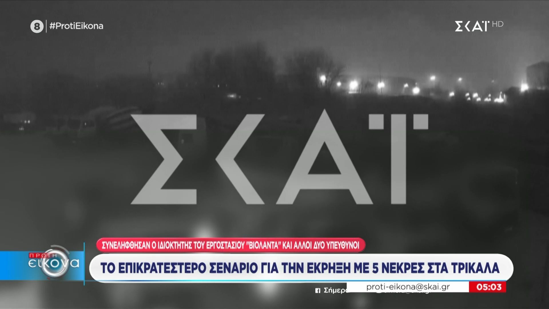 Στην αρμόδια εισαγγελία Τρικάλων οδηγούνται σήμερα τρεις συλληφθέντες για τη φονική έκρηξη που σημειώθηκε στο εργοστάσιο της Βιολάντα. Οι συλληφθέντες περιλαμβάνουν τον ιδιοκτήτη της επιχείρησης, τον τεχνικό ασφάλειας και τον τεχνικό βάρδιας, οι οποίοι συνελήφθησαν από την Διεύθυνση Αντιμετώπισης Εγκλημάτων Εμπρησμού.