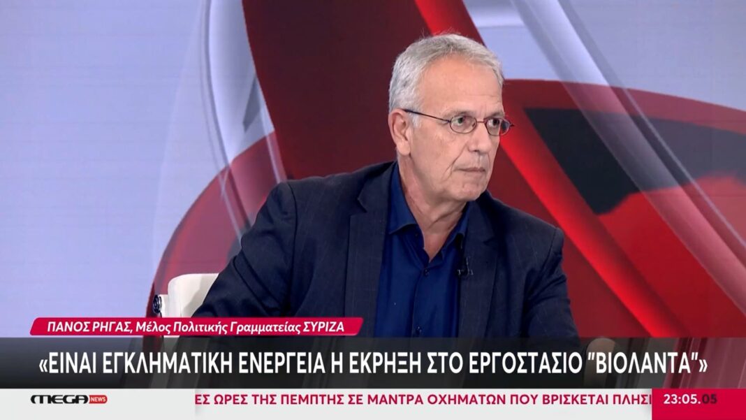 Ο Πάνος Ρήγας, μέλος της Πολιτικής Γραμματείας του ΣΥΡΙΖΑ, χαρακτήρισε την πρόσφατη έκρηξη στο εργοστάσιο “Βιολάντα” ως εγκληματική ενέργεια. Σε δηλώσεις του, τόνισε την ανάγκη για άμεσες έρευνες και λογοδοσία, υπογραμμίζοντας τη σοβαρότητα της κατάστασης.