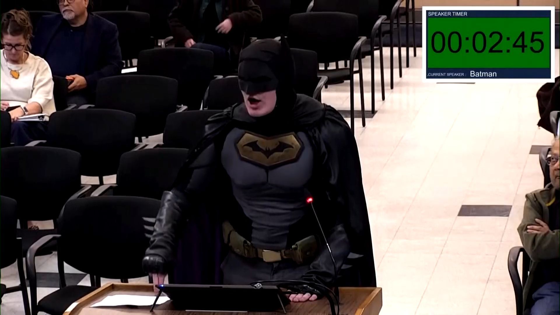 Στη συνεδρίαση του δημοτικού συμβουλίου της Σάντα Κλάρα, ένας άνδρας ντυμένος ως «Batman» ζήτησε την άμεση διακοπή της συνεργασίας με την Ομοσπονδιακή Υπηρεσία Μετανάστευσης και Τελωνείων (ICE). Κατηγόρησε τα μέλη του συμβουλίου για αδράνεια και υπογράμμισε ότι η απουσία σαφούς στάσης θέτει σε κίνδυνο την ασφάλεια των πολιτών.
