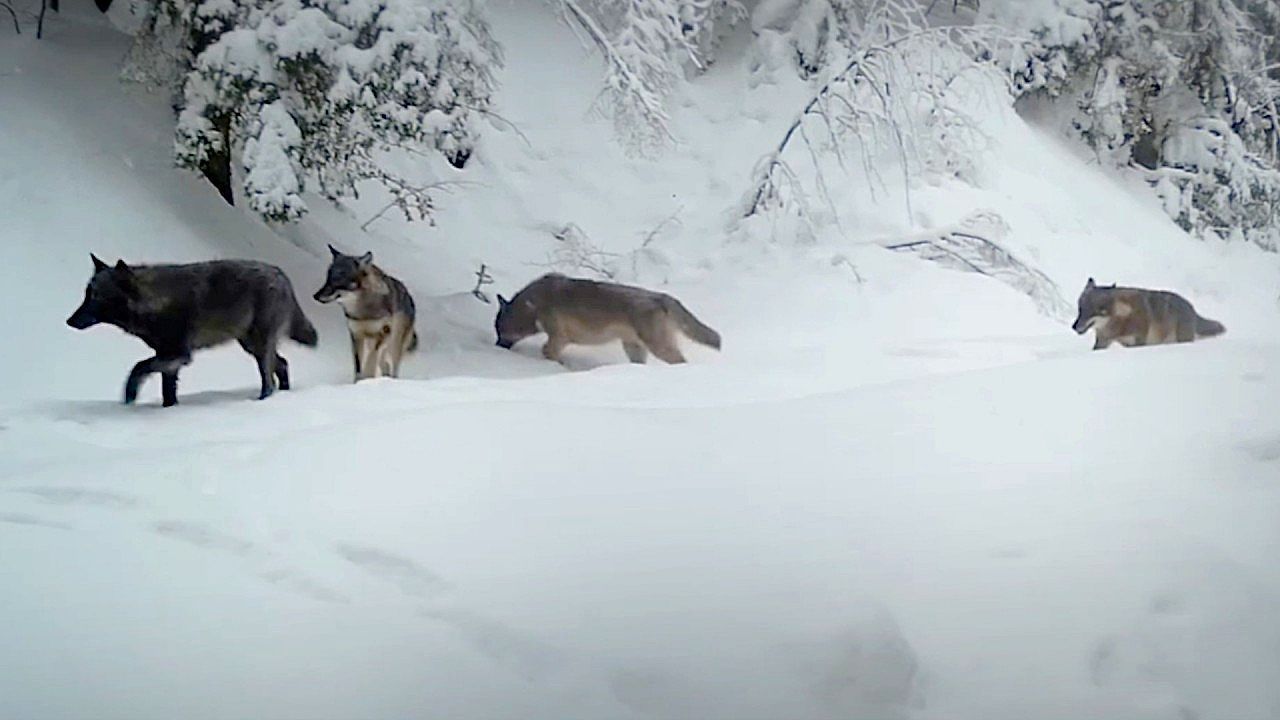 Μια αγέλη λύκων εντοπίστηκε να περιπλανιέται σιωπηλά σε ένα χιονισμένο δάσος στην κεντρική Κροατία. Σύμφωνα με τους υπεύθυνους του Εθνικού Πάρκου Πλιτβίτσε, οι λύκοι φαίνεται να ακολουθούν ίχνη αγριογούρουνων, προσφέροντας μια σπάνια ματιά στην άγρια ζωή της περιοχής.