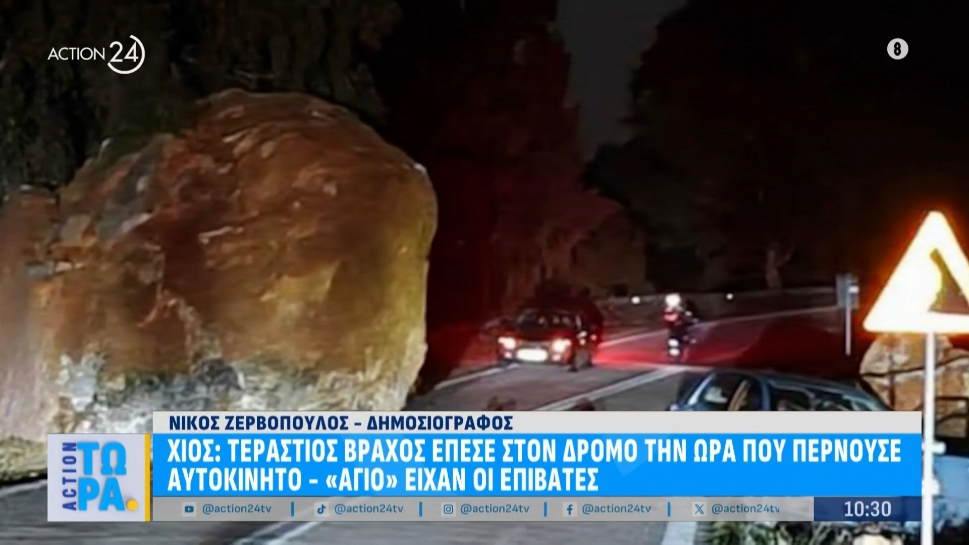 Τεράστιος βράχος κατέπεσε ξαφνικά στον δρόμο της Χίου την ώρα που περνούσε ένα αυτοκίνητο, προκαλώντας πανικό στους επιβάτες. Ευτυχώς, κανείς δεν τραυματίστηκε, καθώς οι επιβάτες είχαν την τύχη με το μέρος τους και πρόλαβαν να αντιδράσουν έγκαιρα.