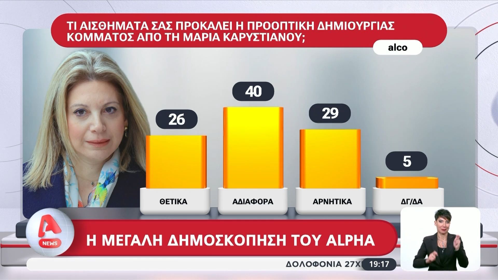 Μια πρόσφατη δημοσκόπηση της Alpha αποκαλύπτει τις απόψεις των πολιτών σχετικά με τη Μαρία Καρυστιανού και την πολιτική της πορεία. Σύμφωνα με τα αποτελέσματα, η υποστήριξη για το κόμμα της παρουσιάζει αυξητικές τάσεις, με πολλούς να εκφράζουν θετική γνώμη για τις πολιτικές της θέσεις.