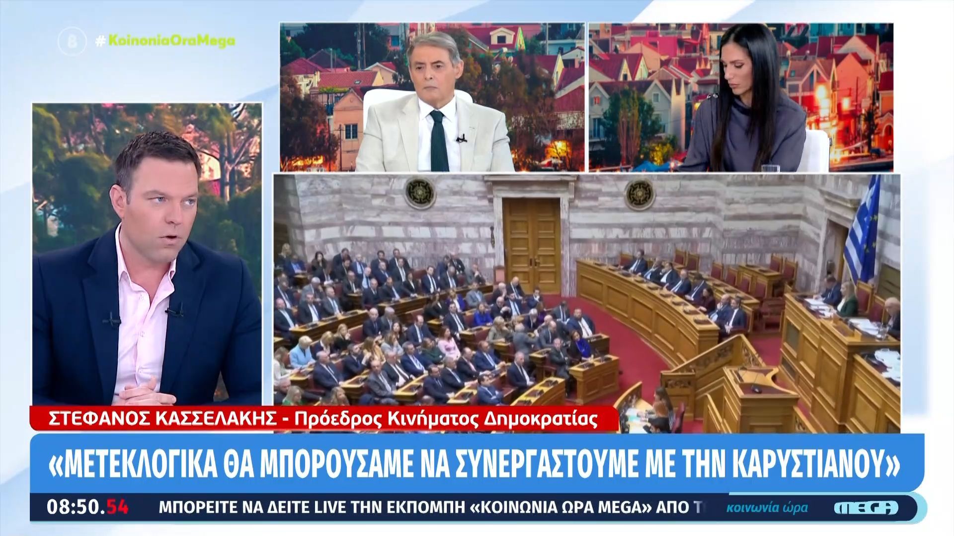 Ο Στέφανος Κασσελάκης, πρόεδρος του Κινήματος Δημοκρατίας, εξέφρασε τη θέση του σχετικά με τη συνεργασία του κόμματός του με την Καρυστιανού σε θέματα που αφορούν το Κράτος Δικαίου. Στη συζήτηση που πραγματοποιήθηκε στην εκπομπή «Κοινωνία Ώρα Mega», υπογράμμισε τη σημασία της ενότητας και της κοινής δράσης για την προώθηση δημοκρατικών αξιών.