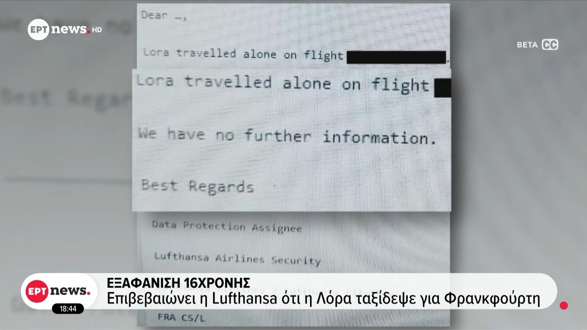 Η Lufthansa επιβεβαίωσε ότι η 16χρονη Λόρα ταξίδεψε από την Αθήνα προς τη Φρανκφούρτη, εν μέσω ανησυχιών για την εξαφάνισή της. Η οικογένειά της έχει απευθυνθεί στις αρχές, ζητώντας βοήθεια για τον εντοπισμό της.