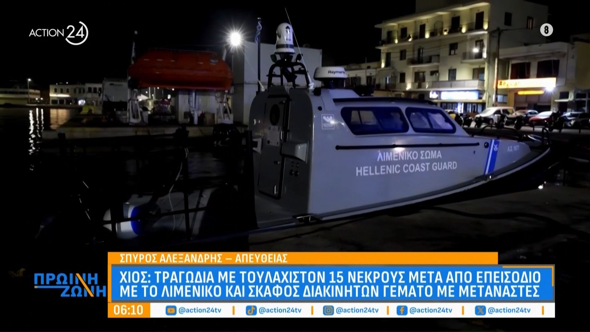 Λιμενικό και διακινητές συγκρούστηκαν κοντά στη Χίο με τουλάχιστον 15 νεκρούς, ανατροπή σκάφους κατά την καταδίωξη, έρευνες εν εξελίξει για επιζώντες.