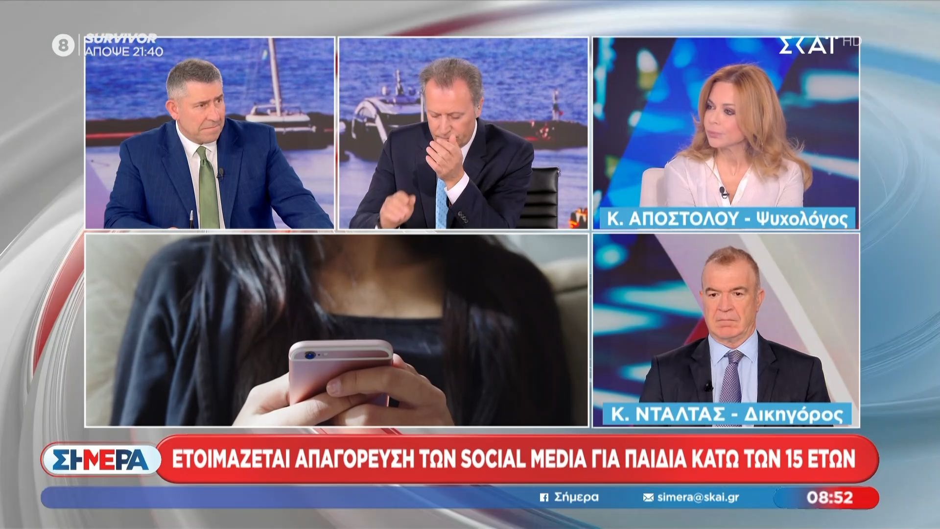 Η συζήτηση γύρω από την απαγόρευση των κοινωνικών μέσων για παιδιά κάτω των 15 ετών κερδίζει έδαφος. Ο δικηγόρος Κώστας Ντάλτας επισημαίνει τις νομικές προεκτάσεις αυτής της απόφασης, ενώ η ψυχολόγος Κρυσταλλία Αποστόλου τονίζει τους κινδύνους που αντιμετωπίζουν οι ανήλικοι χρήστες.