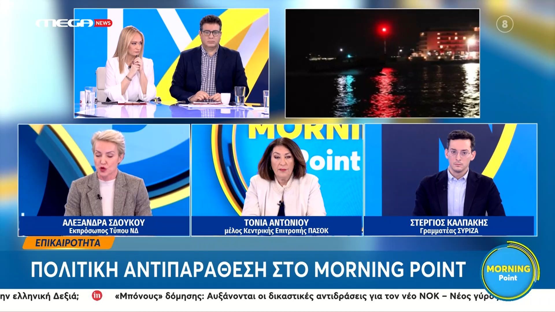 Στο σημερινό επεισόδιο, η Αλεξάνδρα Σδούκου, η Τόνια Αντωνίου και ο Στέργιος Καλπάκης αναλύουν τις πολιτικές προεκτάσεις της πρόσφατης τραγωδίας στη Χίο. Οι συμμετέχοντες εκφράζουν διαφορετικές απόψεις σχετικά με τις ευθύνες και τις αντιδράσεις της κυβέρνησης, εν μέσω έντονης κοινωνικής ανησυχίας.