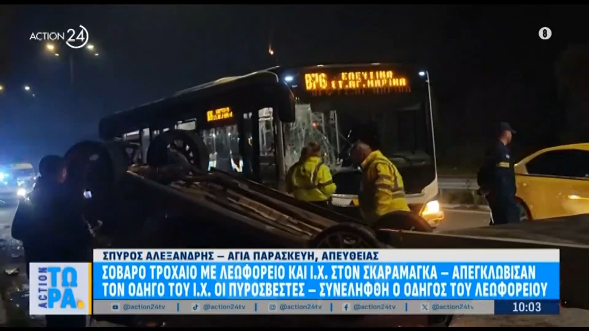 Σοβαρό τροχαίο σημειώθηκε στον Σκαραμαγκά, όταν ένα ΙΧ συγκρούστηκε με λεωφορείο. Ο οδηγός του ΙΧ χρειάστηκε να απεγκλωβιστεί από την Πυροσβεστική Υπηρεσία, καθώς είχε εγκλωβιστεί στο όχημά του λόγω της σφοδρής σύγκρουσης.